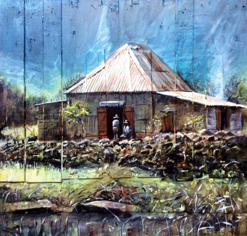 L’oeuvre de Damien Clavé est également très originale de par la diversité de ses supports. Il travaille sur des bardeaux ou de la tôle et produit des oeuvres authentiques au caractère rare.